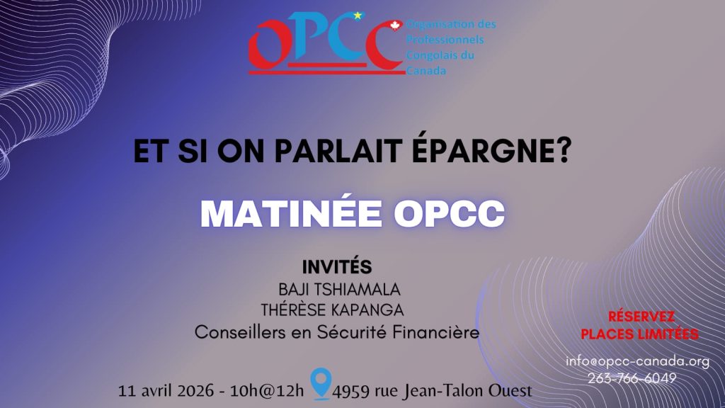 Rejoignez l’Organisation des Professionnels Congolais du Canada ce samedi 11 avril, pour une matinée d’échanges, consacrée à un enjeu majeur de notre avenir financier : l’Épargne!